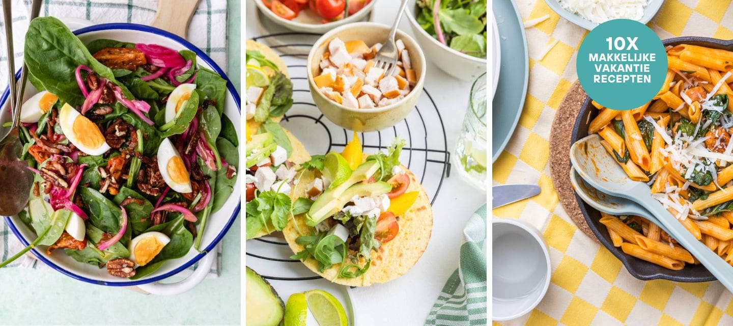 Deze 10 makkelijke vakantie recepten zijn perfect voor drukke dagen met weinig kooktijd. Denk aan frisse maaltijdsalades, simpele pastarecepten en eenpansmaaltijden. Het zijn allemaal gerechten zonder gedoe, koken met weinig keukengerei en vaak zonder dat je lang achter het fornuis hoeft te staan. Perfect voor je na een dag zwemmen, sightseeing of dagje pretpark.