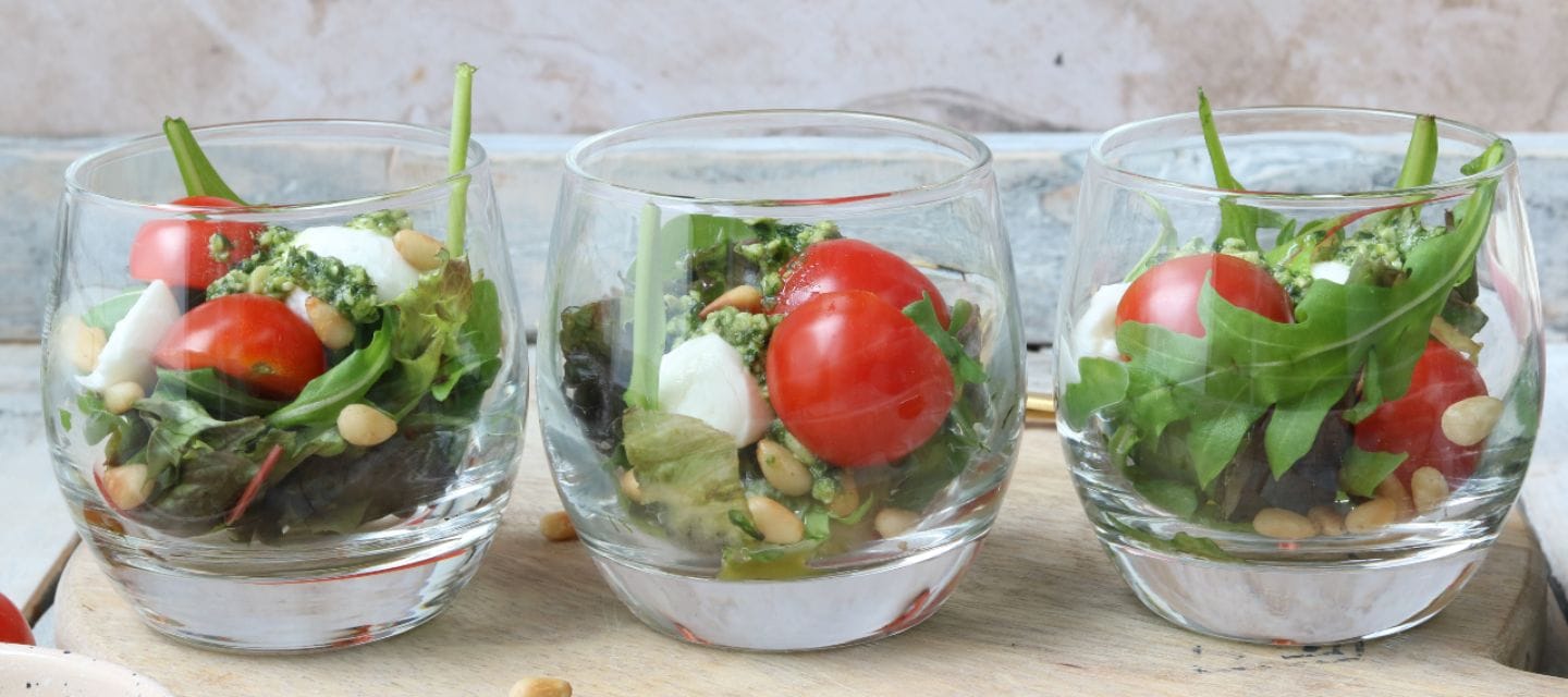 Eigenlijk is er helemaal niks spannend aan dit kerstrecept. Door het hapje in een klein glaasje te serveren, ziet deze amuse er direct feestelijk uit. Deze salade is een variatie op de salade caprese. Een lekker fris hapje van rucola, mozzarella, cherrytomaatjes en pijnboompitjes. Als smaakmaker giet ik er een klein beetje crema di balsamico over, te vinden bij het olijfolie en azijn schap. Je kunt ook zelfgemaakte pesto gebruiken.