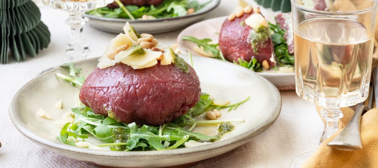- Bekleed een ondiep kommetje met vershoudfolie, leg er 1 portie carpaccio op. Vul met ¼ van de pesto crème. Vouw de buitenste randen van de carpaccio naar binnen en vouw dicht. Draai het folie strak, zodat er een bal ontstaat en laat 1 uur opstijven in de koelkast. Herhaal dit met de andere 3 porties.