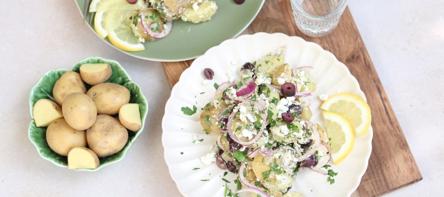 Wat deze aardappelsalade echt Grieks maakt is de verkruimelde feta en zwarte Kalamata olijven. De rode ui geeft pit en de frisse citroen voor tegenwicht.