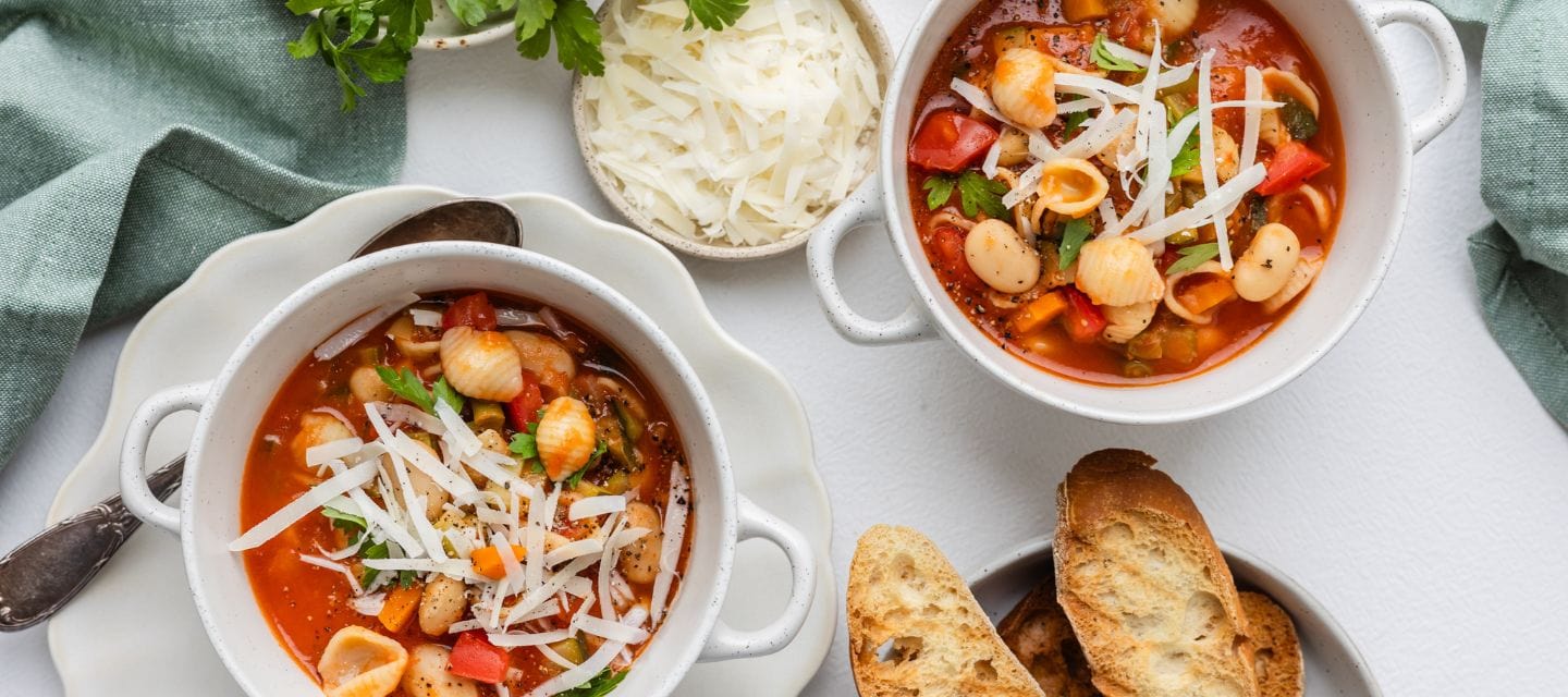Minestrone is een goedgevulde Italiaanse groentesoep. Het fijne aan deze soep is dat je het naar smaak kunt aanpassen. De basis bestaat uit ui, wortel, bleekselderij, tomaat en witte bonen met pasta. Vul de soep aan met ingrediënten uit het seizoen of restjes uit de koelkast.