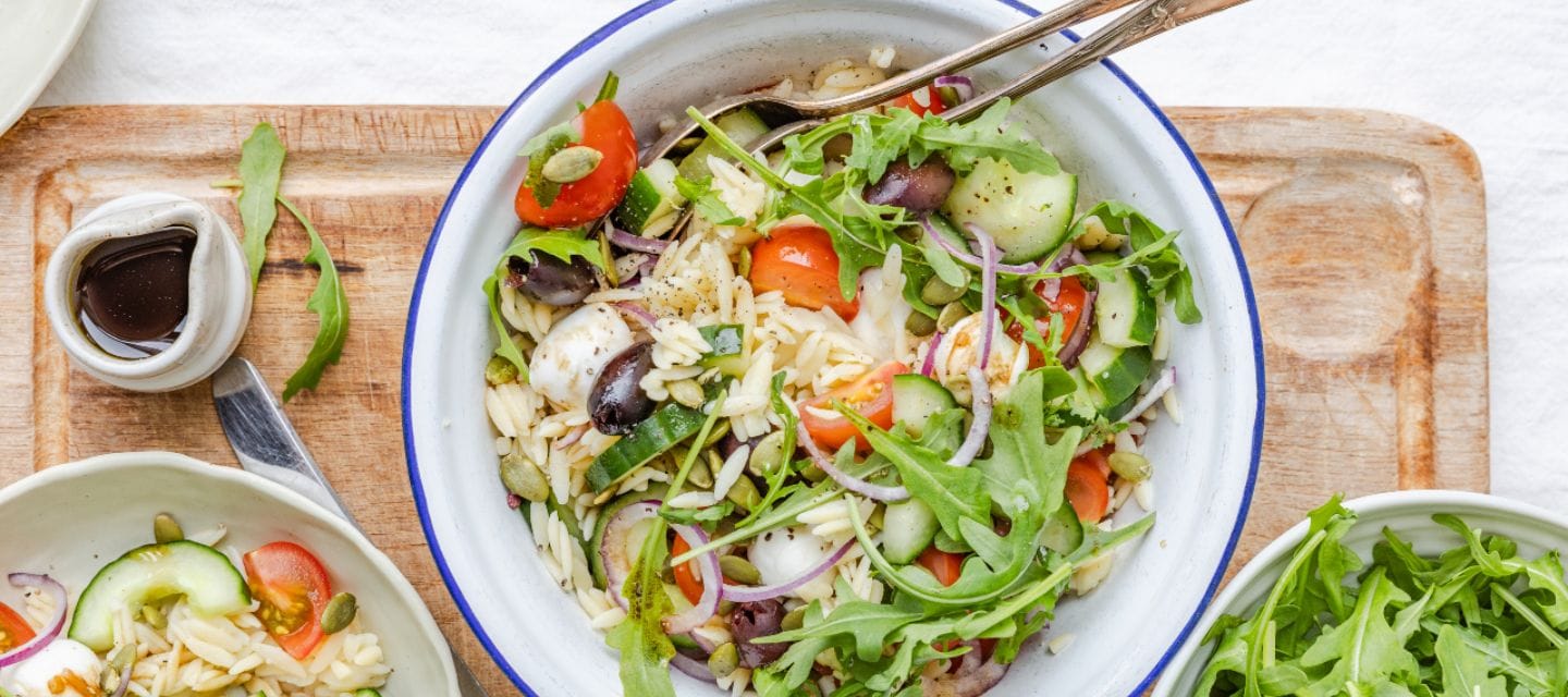 Orzo is makkelijk en snel te bereiden. Het hoeft slechts 8 minuten voor een pasta “al dente”. Ondertussen kun je de cherrytomaten, komkommer, rode ui, olijven en mozzarella bolletjes bereiden. Daarna hussel je alle ingrediënten door elkaar en giet je de zelfgemaakte salade dressing erover. Voila, je bent klaar om aan tafel te gaan.