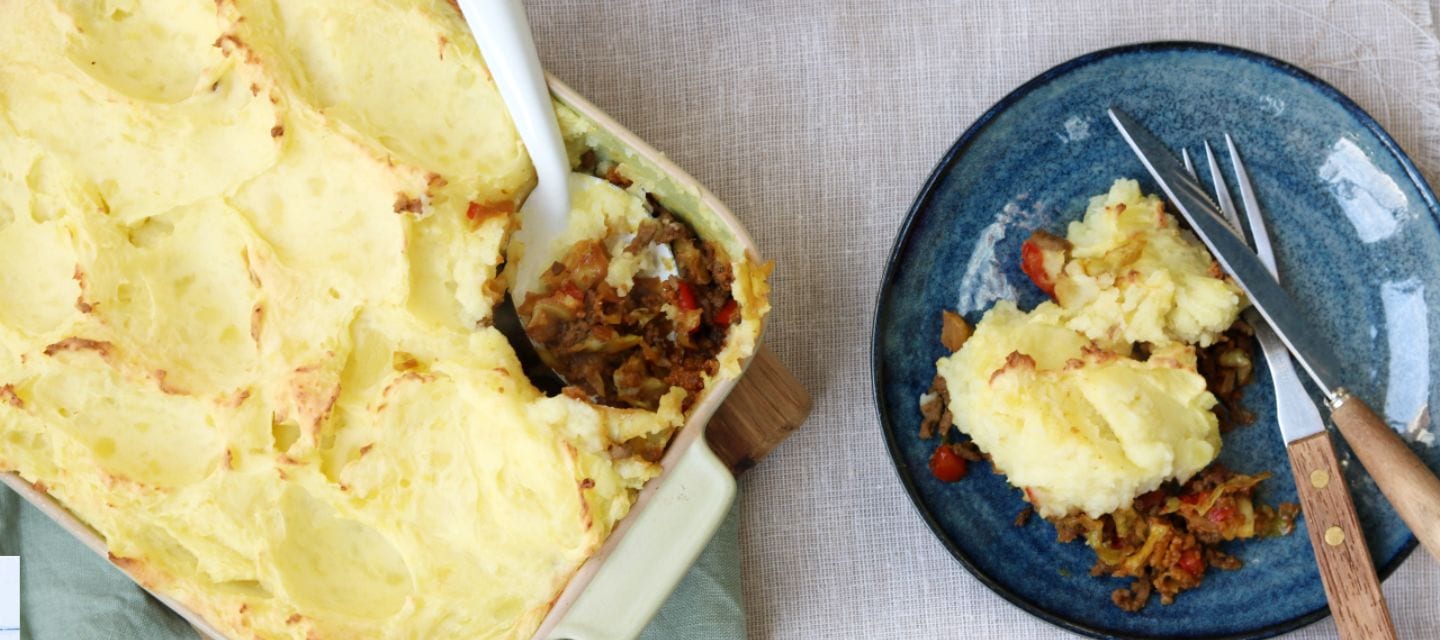 De ovenschotel wordt afgedekt met een laag aardappelpuree. Voor een extra groente intake kun je ook kiezen voor zoete aardappelpuree.