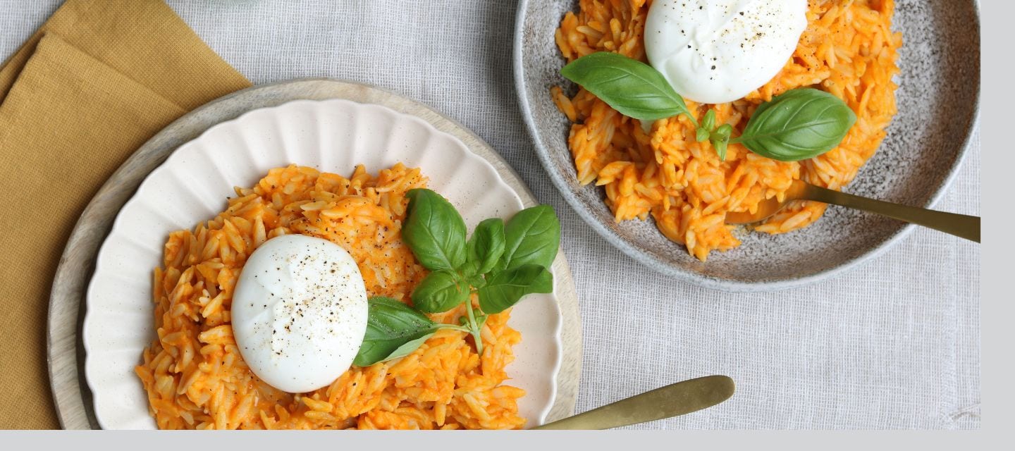 - Kook ondertussen orzo of een andere pasta naar keuze. Meng een hoeveelheid saus naar smaak met de pasta. Zet de burrata on top en serveer direct.