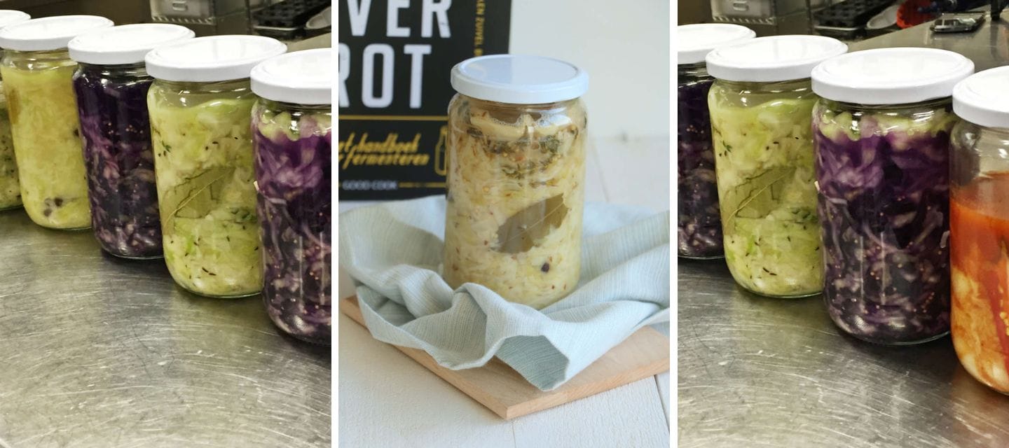 Bij het fermenteren van groente worden de suikers uit de groente door melkzuurbacteriën omgezet in melkzuur. Zoals je weet bevat groente van nature suikers maar ook melkzuurbacteriën (nieuw voor mij). Door vocht wordt het hele proces in gang gezet. Daarnaast heb je zout nodig die de groei van de goede bacteriën bevordert en de slechte remt. Vervolgens is het van belang om de groenten onder water te houden om zo af te sluiten van zuurstof. Bij zuurkool is dat geen probleem, want dit bevat van zichzelf vaak al voldoende vocht. Bij andere groenten dien je pekelwater (5% zout op 1 liter) toe te voegen.