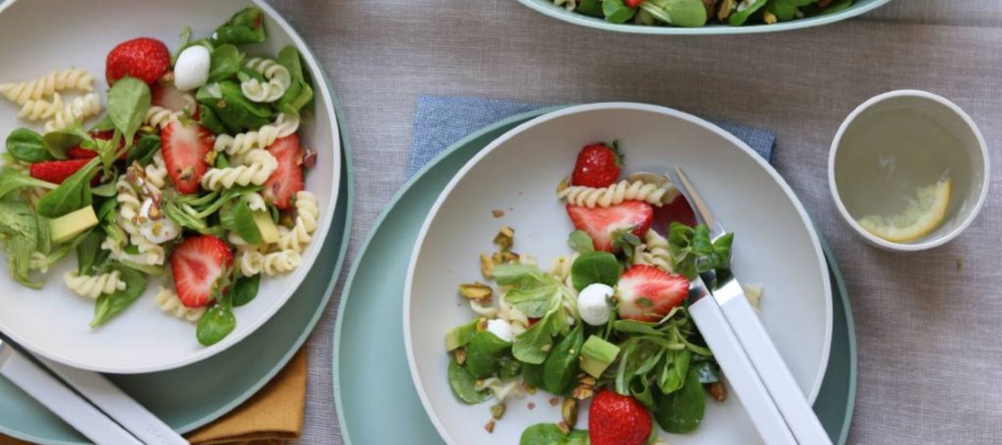 - Meng de pasta met de aardbeien, avocado, veldsla en de dressing. Verdeel als laatste de geitenkaas en pistachenootjes erover.